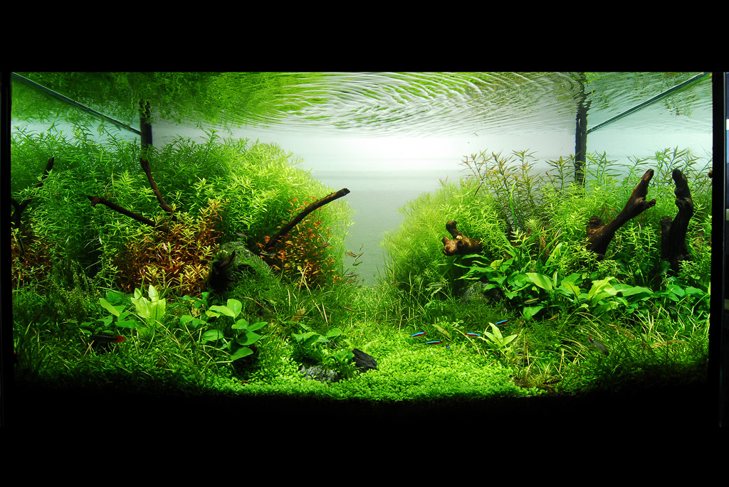 Após alguns dias da água colocada (nesses primeiros dias não há necessidade de iluminação), com os filtros funcionando e os parâmetros de pH (neutro), KH (3 a 6) e temperatura em torno de 26oC, podemos habitar o aquário com as plantas, com o cuidado no posicionamento delas. Para isso podemos fazer um layout da disposição de plantas, troncos e pedras maiores. Plantas baixas na frente e no comprimento (Samolus sp., Echinodorus tenellus, Sagitaria subulata, Cryptocoryne nevillii e beckettii, Hygrophila difformis - sinemá), medianas no meio (Cabomba sp., Bacopa sp., Ludwigia sp., Hygrofila polysperma, Echinodorus amazonicus, E. portoalegrensis, E. horizontalis, Cryptocoryne wendtii, C. ciliata, Lobelia, Nymphoides aquatica - bananinha, Nymphea sp., Nuphar japonica, Anubias lanceolata), altas atrás e nas laterais (Aponogeton undulatus, A. crispus, Cryptocoryne pontederifolia, Vallisneria sp., Lagenandra lancifolia). Plantas como a Cardamine lyrata - avenca d’água, ou Vesicularia dubyana - musgo de java, podem simplesmente serem colocadas em cima de um tronco ou pedra. Microsorum pteropus, e Anubias nana, entre outras, devem ser plantadas num pedaço de madeira ou diretamente no tronco. Podemos também colocar algumas plantas flutuantes como Eichhornia crassipes - aguapé, Lemna sp. - lentilha d’água, Pistia stratiotes - alface d’água, Salvinia sp., Ceratopteris cornuta - samambaia d’água, pois ajudam a retirar o excesso de nutrientes, principalmente fosfatos.